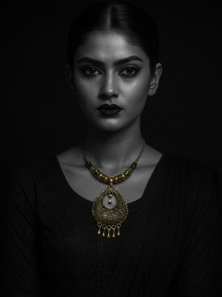 Disclaimer: AI generated model, don’t compare pendant size from model’s wear.
